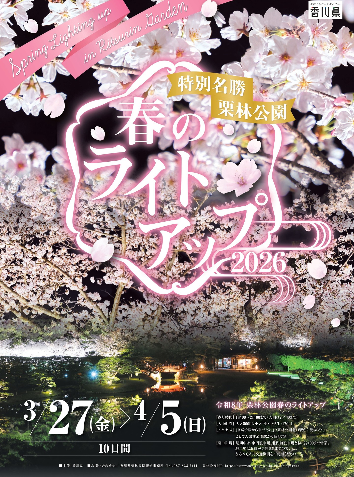🌸令和8年 栗林公園 春のライトアップ🌸 期間:3月27日(金)~4月5日(日) 美しい庭園と夜桜のライトアップが織りなす幻想的な空間をお楽しみください。 ま・・・